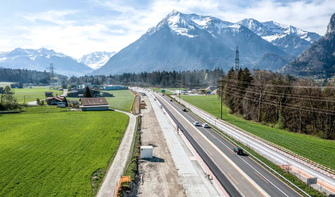Im Rahmen der Gesamterneuerung der A6 zwischen Thun-Süd und Spiez wird der Verkehr versetzt geführt, um so genügend Platz für die Arbeiten und die nötige Logistik zu schaffen. Die veränderte Verkehrsführung wird dabei mit oranger Markierung angezeigt.
