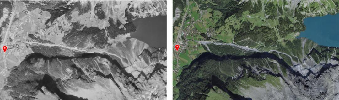 Die Bildsammlung gilt als einzigartiges Kulturgut: Sie dokumentiert die Veränderung von Städten, Dörfern und Berglandschaften über beinahe 100 Jahre hinweg. Im Kartenviewer des Bundes (map.geo.admin.ch) kann die Schweiz flächendeckend oder jahresweise betrachtet werden. So lässt sich etwa der Rückzug der Gletscher, die Ausbreitung von Siedlungsgebieten oder der Bau neuer Verkehrswege eindrücklich nachvollziehen.