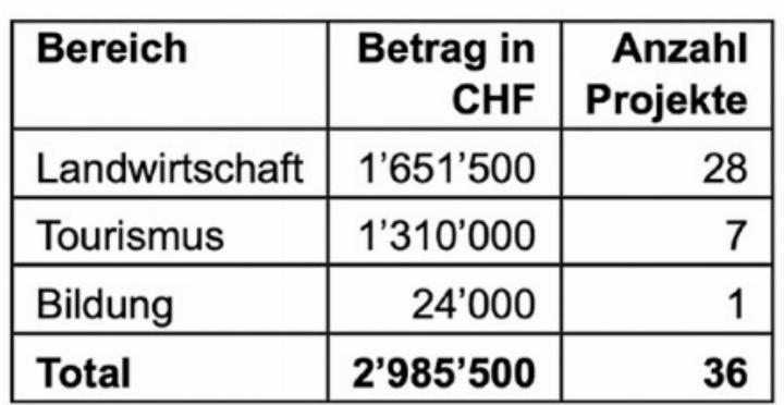 Jedes dieser Projekte trägt zur Wertschöpfung und wirtschaftlichen Vielfalt im Schweizer Berggebiet bei wie die Organisation meldet. Diese finanzielle Unterstützung kam 36 Projekten im Berggebiet zugute. Diese sind verteilt auf zwölf Kantone und stammen von Kleinund Kleinstbetrieben, die in den Bereichen Landwirtschaft, Tourismus und Bildung tätig sind. Mit diesen finanziellen Beiträgen verbessert die Schweizer Berghilfe die Existenzgrundlage und Lebensbedingungen der Bergbevölkerung. Sie schaffe damit wichtige Wertschöpfung und Arbeitsplätze in den Bergregionen und wirke so der Abwanderung entgegen, heisst es in der Mitteilung.