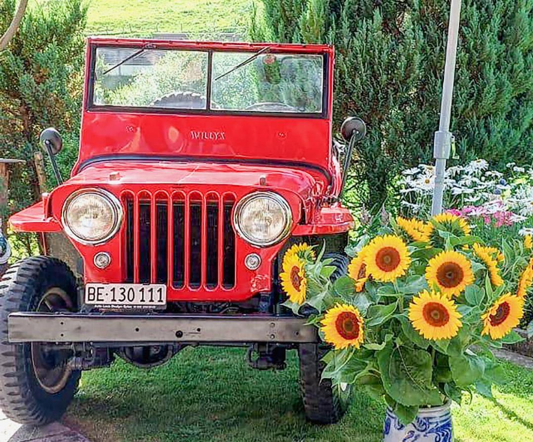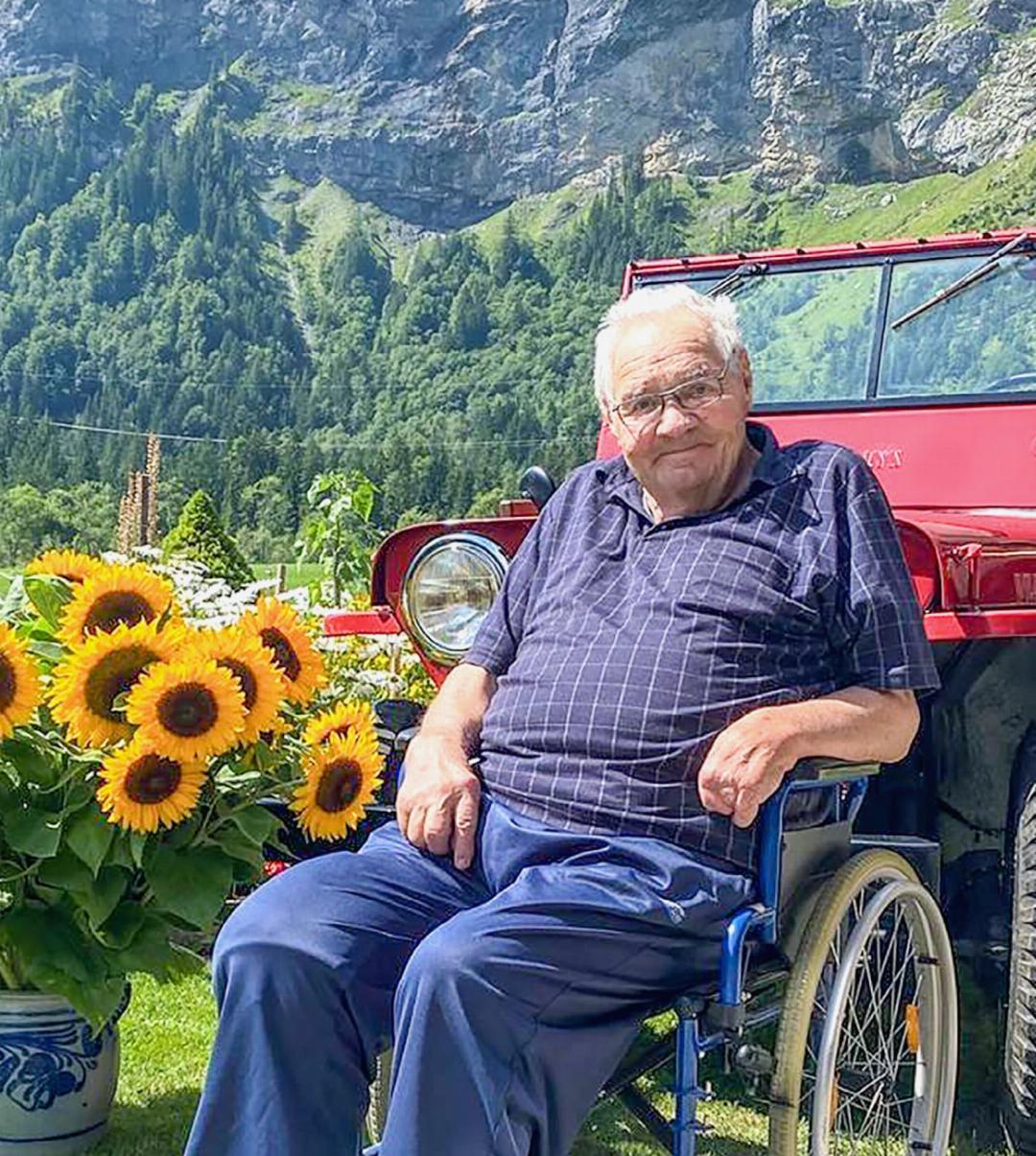 Seinen 90. Geburtstag durfte der Jubilar im August bei ihnen zu Hause in Kandersteg feiern. Der gemeinsame Sohn des Ehepaars Schnidrig stellte dafür ein Festzelt auf, in dem Erika einige Leckerbissen für Besucherinnen und Besucher ihres Ehemannes bereitstellte. Als Dekoration daneben schmückte ihr Sohn Salomon Schnidrigs 1947er-Jeep mit 20 leuchtenden Sonnenblumen.
