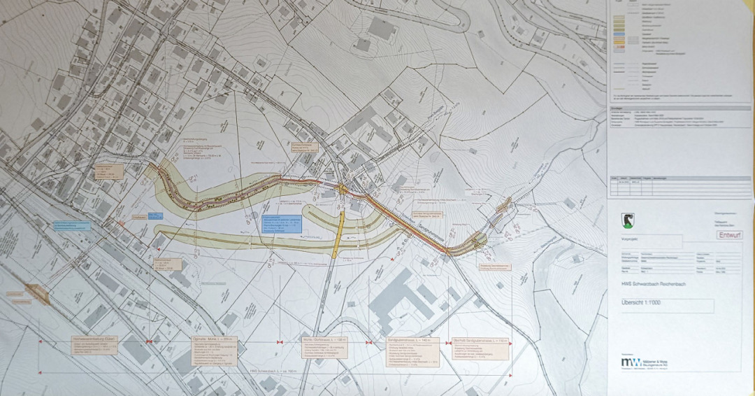 Während des Anlasses im Kirchgemeindehaus Reichenbach stellte Peter Bettschen, Präsident der Gesamtschwellenkorporation, die bisherigen Projekte zum Hochwasserschutz Schwarzbach vor und erläuterte die Entwicklung. Anschliessend präsentierte Stefan Tschiemer, Projekt- und Bauleiter des Ingenieurbüros Mätzener & Wyss AG, den aktuellen Entwurf zur Eindämmung eines möglichen Hochwassers.