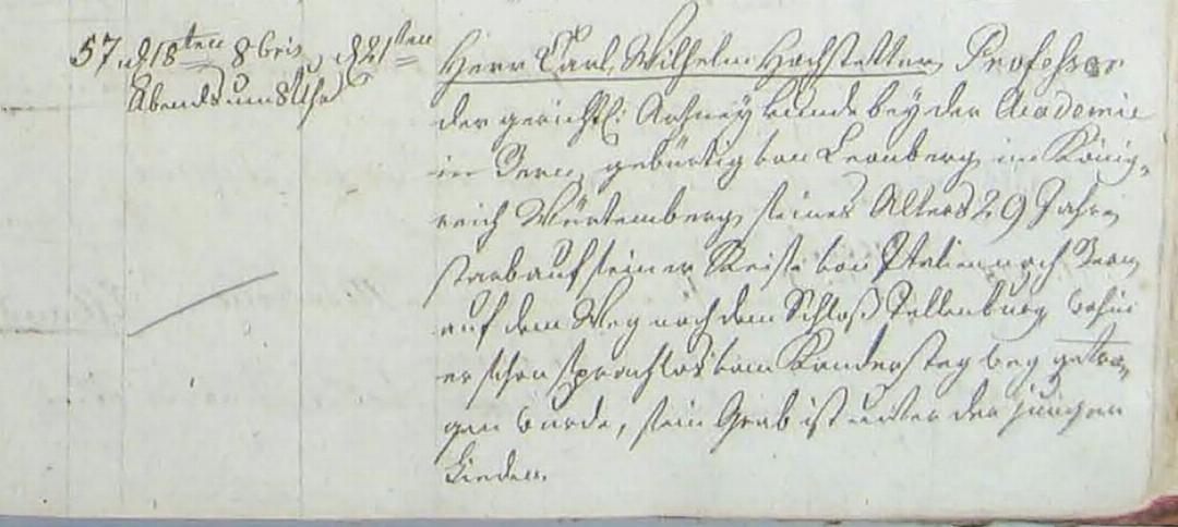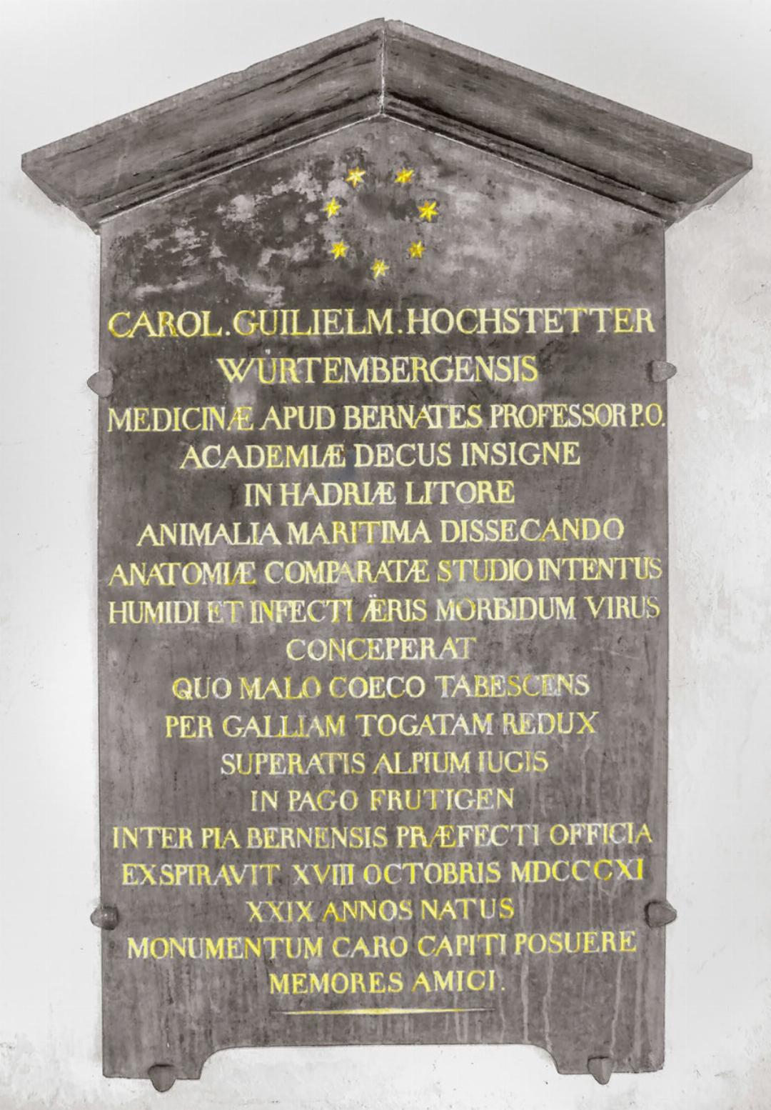 Der Rückblick beginnt mit einer Übersetzung des lateinischen Textes der Tafel: «Karl Wilhelm Hochstetter, ein Württemberger, öffentlicher ordentlicher Professor der Arzneykunst in Bern, eine ausgezeichnete Zierde der Akademie, der am Ufer des adriatischen Meeres Seetiere untersuchend, mit dem Studium der vergleichenden Anatomie beschäftigt, das Krankheitsgift einer feuchten und ansteckenden Luft eingesogen hatte, und an diesem verborgenen Übel schmachtend, durch das Piemont zurückkehrend, nachdem er die Alpenpässe überschritten hatte, in Frutigen unter menschenfreundlicher Besorgung des bernischen Oberamtmanns am 18. Weinmonat 1811 in einem Alter von 29 Jahren starb. Freunde, denen er unvergesslich ist, setzten dem Teuren dieses Denkmal.»