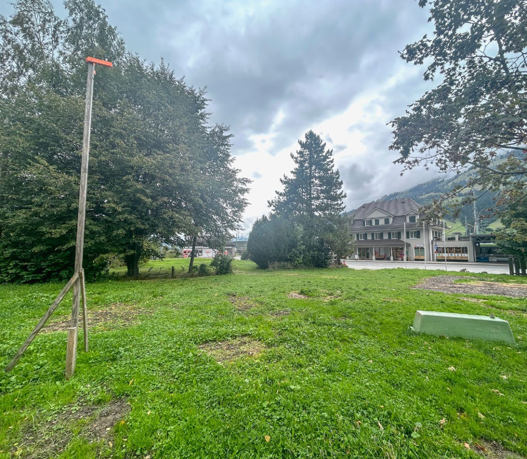 Die temporäre Kinderbaustelle der Offenen Kinder- und Jugendarbeit Niesen beim Bahnhof Frutigen ist verschwunden. Aber bald wird auf dieser Wiese wieder gebaut: Die Profile zeigen an, dass ein neues Infozentrum des Bahnunternehmens Realität werden soll – das Baugesuch ist derzeit publiziert.