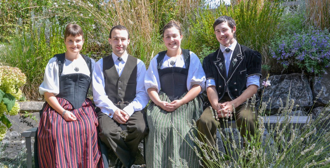 Vier junge Menschen, vier verschiedene Trachten, eine gemeinsame Leidenschaft: das Tanzen seit Kindertagen.