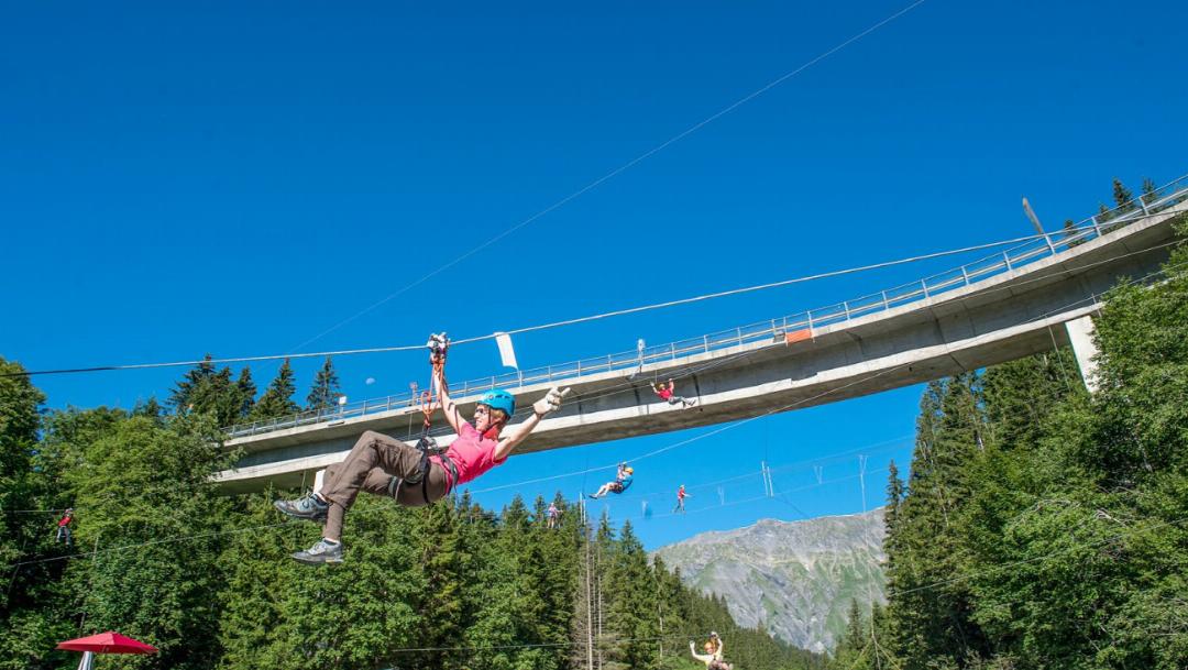 Die Alpinschule suchte immer wieder nach weiteren Verdienstmöglichkeiten und so wurden vor 20 Jahren im Jahr 2005 die ersten Ausbauschritte für den Adventure Park im Rehärti in Adelboden vorgenommen. Nachdem sich die Bewilligungsprozedur in die Länge gezogen hatte, konnte erst 2015 ein grosser Schritt zur Realisation des gesamten Parks gemacht werden. 2018 wurde noch die lange Seilbahn gebaut. Und als weiteres «Coronaprojekt» wurde 2020 zusätzlich ein Parcours für Kinder ab vier Jahre gebaut. Heute ist der Adventure Park ein zentraler Pfeiler im Sommertourismus. Angeboten werden im Adventure Park Seilbahnen bis zu 320 Meter Länge, Abseilen und Seilbrücken, der Kinderparcours und ein Pendelschwung – so etwas wie eine riesige Schaukel.